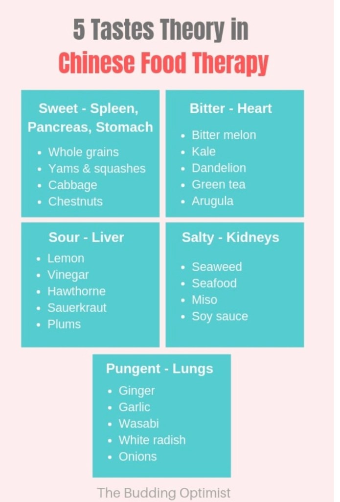 Again, the idea is that we can enhance organ functions and achieve better overall health by using these flavours in an intentional, mindful way. For example, incorporating more sour foods into your diet will help strengthen and detoxify the liver while eating bitter foods benefits the heart and small intestines and helps with alleviating anxiety and excessive heat within the body.